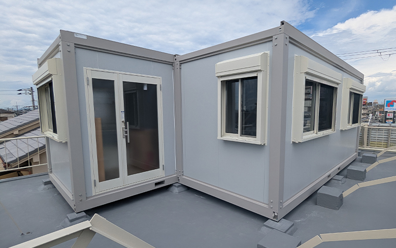 屋上の形状により一般的な連結方法のユニットハウスだと小さすぎることから、2種類のサイズが異なるユニットハウスを3棟連結させる「変則連棟型」を採用し、屋上の限られたスペ―スを最大限に活用できました。