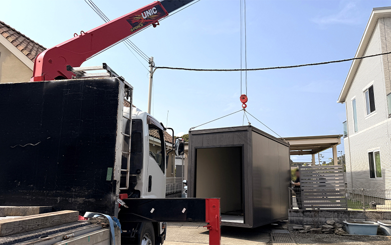 ”小さいユニットハウスを自宅敷地内に設置したいが、カーポートがあるため設置出来るか”と、ご相談いただきました。